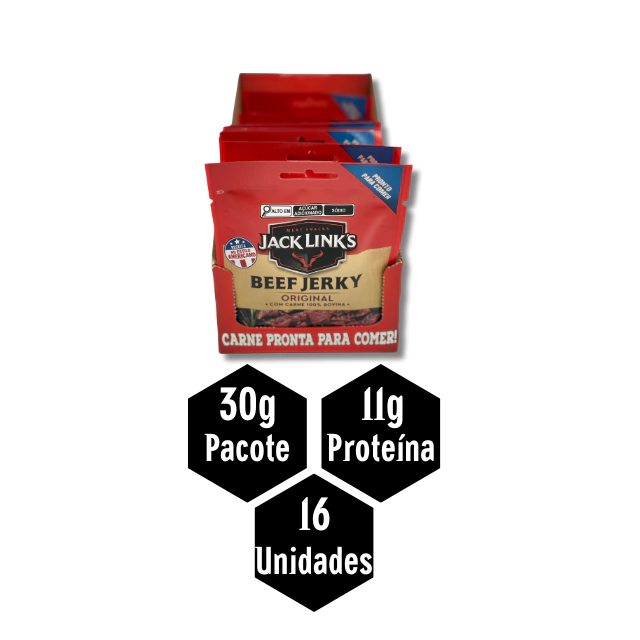 Beef Jerky Original Jack Link's: 30g de carne bovina desidratada, sabor autêntico e alto teor de proteína. Ideal para lanches práticos e nutritivos.