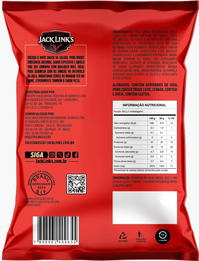 O Pork Rinds Jack Link’s Sabor Bacon 60g é um snack desenvolvido para quem busca crocância intensa, sabor marcante e uma opção com alto teor de proteína para diferentes momentos do dia. Produzido a partir de pele suína e temperado com sabor bacon, oferece uma experiência diferenciada de textura e sabor — ideal para lanches rápidos, para acompanhar a rotina ou para compartilhar.