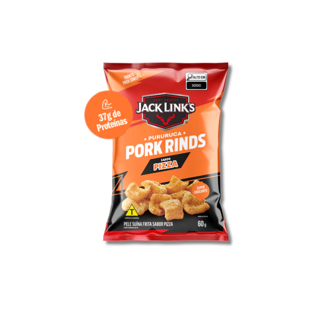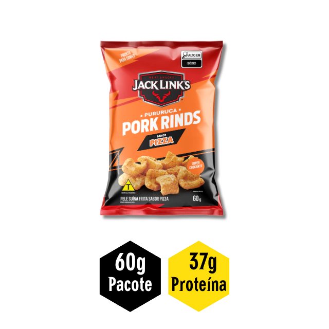 Pork Rinds Jack Link’s Sabor Pizza 60g: snack super crocante, pronto para consumo, com sabor pizza marcante e 37g de proteínas por embalagem.